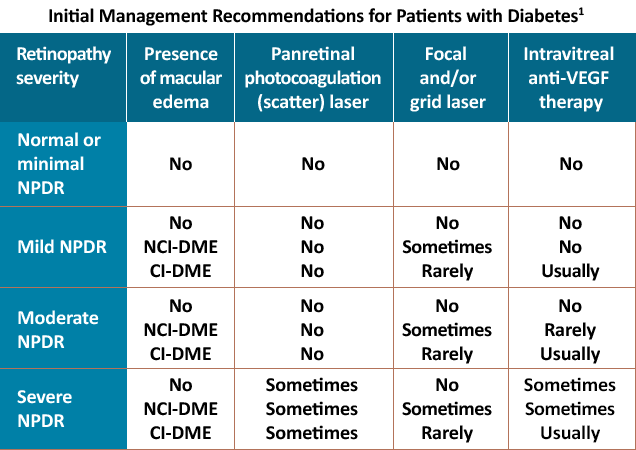 Studies suggest that treating moderate to severe NPDR with anti-VEGF in some people can improve signs of retinopathy and delay progression from severe NPDR to PDR.5,8 The two primary anti-VEGF therapies that are FDA-approved to treat any degree of NPDR are ranibizumab and aflibercept.3 Data from the Protocol S, RISE/RIDE, VIVID/VISTA, and PANORAMA trials show that these anti-VEGF therapies can help eyes with any level of DR, with or without DME.3 Eyes with more advanced NPDR respond particularly well to anti-VEGF therapy, with approximately 80% showing regression of retinopathy severity.3
